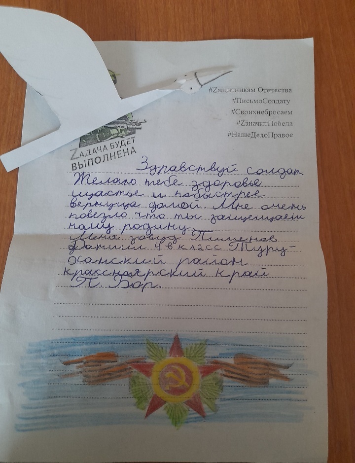 Накануне Международного дня журавлей методисты заповедника «Центральносибирский» провели ученикам третьих и четвёртого класса Борской средней школы познавательное занятие о журавлях. В ходе урока детям рассказали о внешнем виде этих птиц, особенностях их размножения, местах обитания. Также обсудили важность сохранения популяции этих величественных представителей пернатых и их роль в экосистеме.Журавль во многих народных легендах символизирует благополучие и мир. Поэтому ученикам предложили поучаствовать в гуманитарной акции, чтобы поддержать военнослужащих, участвующих в специальной военной операции (СВО). В рамках программы патриотического воспитания дети написали искренние и душевные письма, вложив в них бумажных журавликов — символ мира и надежды. Ребята выразили свои пожелания мира, благополучия и возвращения военнослужащих к мирной жизни.Вот одно из этих важных и дорогих для каждого солдата писем: «Здравствуй, наш защитник! Меня зовут Янченко Виктория. Мне 10 лет. Я из посёлка Бор. Хочу сразу сказать вам спасибо за мирное небо над головой, за солнце, что греет нас, за то, что вы не спите ночами и защищаете нас. И ещё хочу, чтоб вы вернулись домой целыми и здоровыми, чтоб у вас было всегда настроение. Я дарю вам своего журавлика. С любовью Вика.»Военнослужащие с теплотой перечитывают детские письма. Эти послания укрепляют боевой дух и напоминают, что за пределами службы их ждут и помнят. Искренние простые строки вдохновляют и мотивируют солдат. Они помогают сохранять решимость и верить в успешное выполнение задач.Эта акция показывает, что даже маленькие школьники могут сделать что-то важное для Победы.