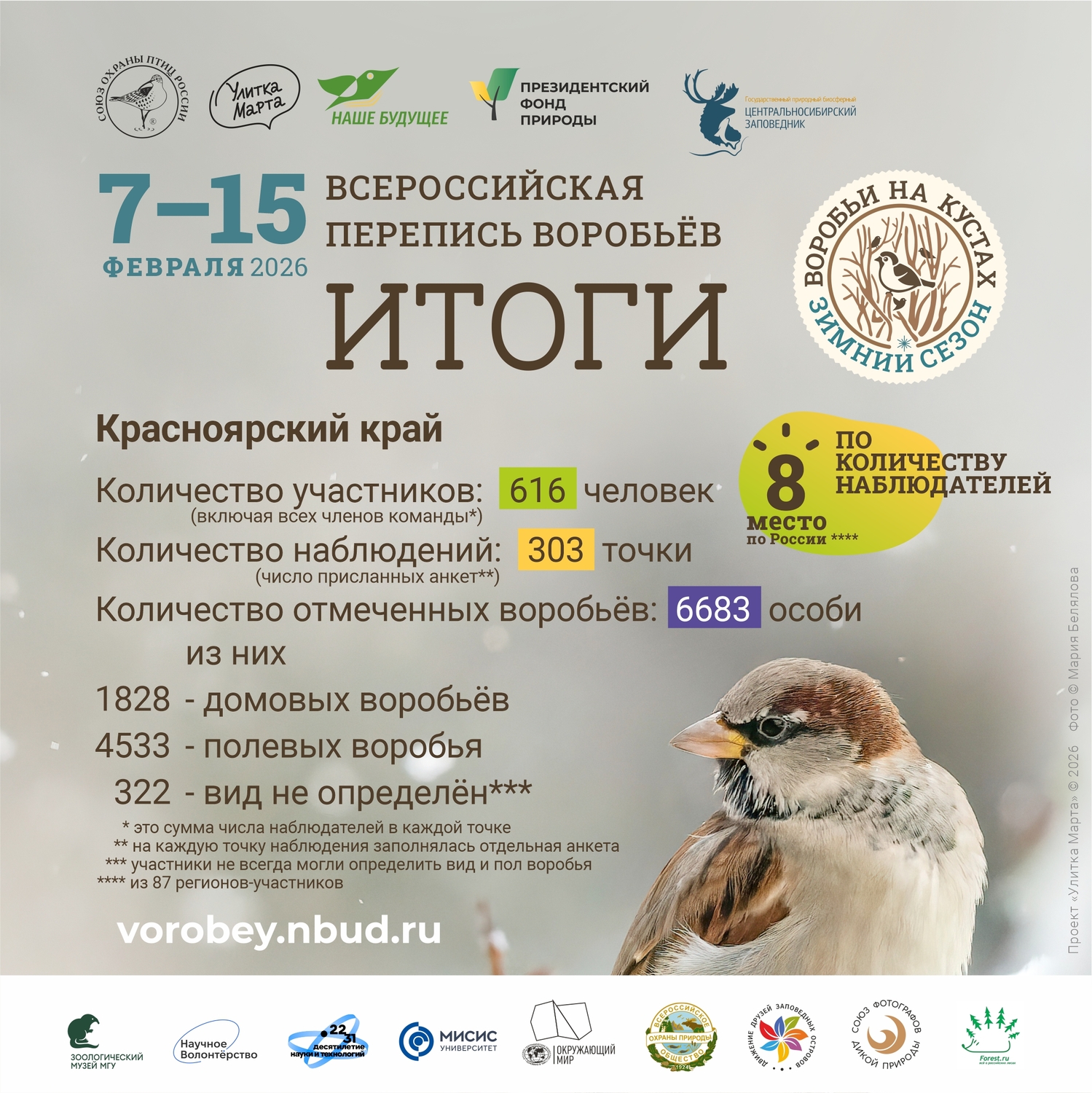 Государственный заповедник «Центральносибирский» во второй раз принимает участие во Всероссийской акции «Воробьи на кустах 2026» в качестве координатора.С 7 по 15 февраля по всей России проводилась перепись пернатых, где нужно было посчитать количество домовых и полевых воробьев. Условии акции просты: сфотографировать воробьев и внести координаты места обнаружения.В этом году количество участников по Красноярскому краю увеличилось с 283 до 616 человек.